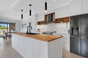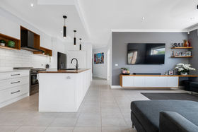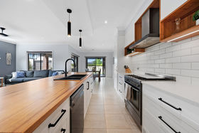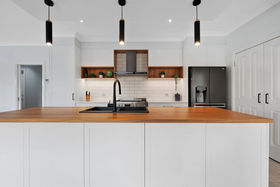 The renovated kitchen is a true centrepiece of the home, combining modern design with everyday functionality. A striking timber island bench creates a warm focal point and offers excellent preparation space, while pendant lighting adds character and definition. White cabinetry is complemented by a classic subway-tiled splashback, matte black fittings and a sleek black sink, delivering a clean and timeless aesthetic.