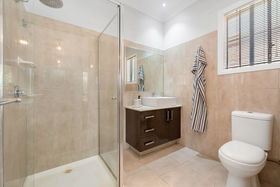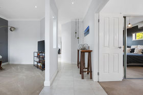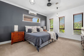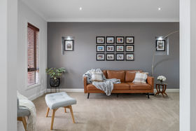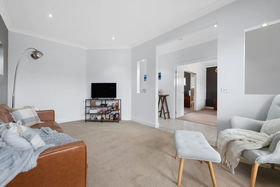 A wide hallway leads through to the first of two living areas, a bright and flexible space that works perfectly as a formal lounge or quiet retreat. The master bedroom is generously proportioned and privately positioned, accessed through double doors and offering a comfortable space to unwind. It includes a ceiling fan, split system and a walk-through robe with mirrored doors that leads to the ensuite, which features dark cabinetry, a large sink and quality finishes.