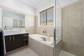 Quality appliances include a 900mm freestanding oven with gas cooktop, along with generous storage, double fridge space and a double-door pantry. Positioned to overlook the dining and living areas, the kitchen connects seamlessly to the outdoors, making it ideal for both daily living and entertaining. Two additional bedrooms are well sized, carpeted and include built-in robes, serviced by a central bathroom with bath, shower and single vanity in dark cabinetry with neutral tiling.