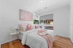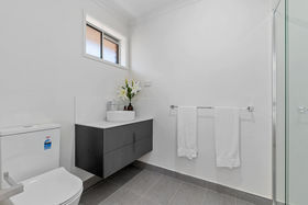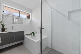 The main bathroom continues the modern theme with light finishes, dark accents, a single vanity, bath and shower. The master bedroom is a true retreat, featuring built-in robe, ceiling fan, beautiful natural light and a private ensuite, thoughtfully separated by a charming barn door. The ensuite showcases dark cabinetry, a sleek shower with niche, and contemporary finishes.
