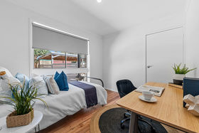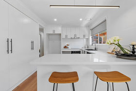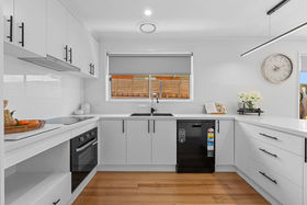 The stunning new kitchen is both spacious and stylish, offering two generous storage cupboards, brand-new dishwasher, oven and stovetop, and striking stone benchtops complemented by dark handles and two tone sink fittings - a space designed to impress and perform.